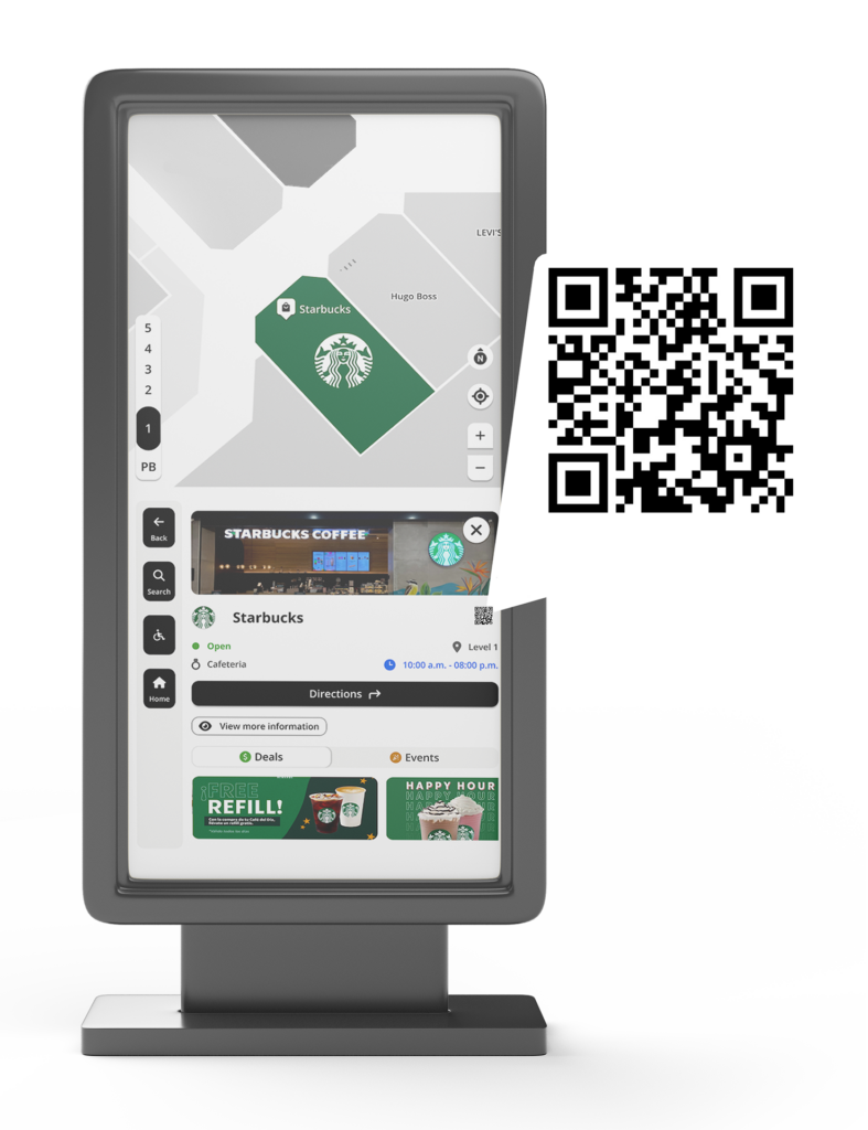Users can seamlessly transition from kiosks to mobile devices by scanning a QR code, ensuring they can take their navigation route with them.